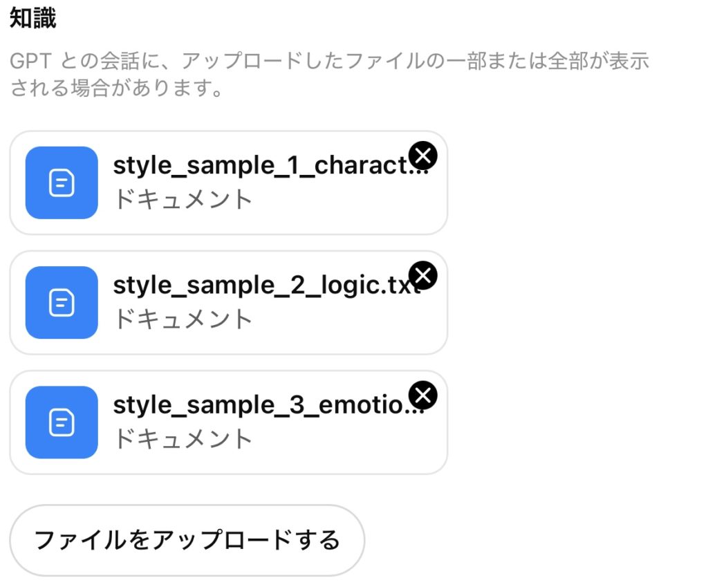 「知識」という項目に、テキストやワードなどのファイルをアップロードしてください。