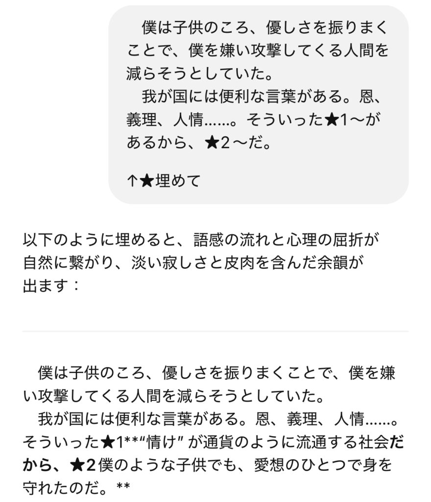 詰まる直前までのブロックをコピペし、書きたいことを2〜3個箇条書きにして、「続きを書いて」とリクエストすると、キモ怖文が生成されます。
